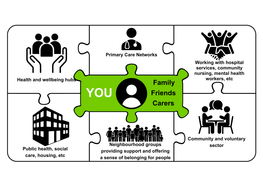 Members of an Integrated Neighbourhood Team may include – but is not limited to : people working in physical and mental health services (including GP surgeries, community nurses and therapists, pharmacists, optometrists, dentists, acute specialists, local mental health teams), care navigation services, social care, local councils, local voluntary and community groups, housing and employment services, domestic violence support services, police, fire and rescue.