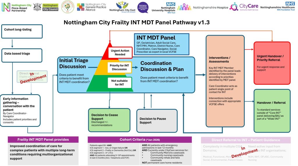 Since 2022 Nottingham City Place Based Partnership has been working to provide care centred around the individual and address the wider determinants of health and wellbeing across a neighbourhood footprint. This Integrated Neighbourhood Working has brought partners together to improve the co-ordination of services for people. As part of that work, the aim now is to spread Integrated Neighbourhood Working across all of Nottingham and Nottinghamshire’s Primary Care Networks and neighbourhoods in the form of Integrated Neighbourhood Teams. In the city we have launched Integrated Neighbourhood Teams or INTS, to support those people with the most complex health and care needs.